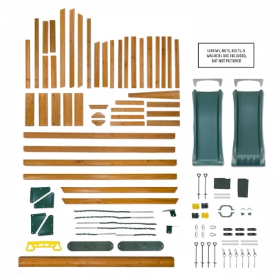 Create the perfect outdoor play space with the Ranger Plus Swing Set with Slide by Swing-N-Slide. This versatile wooden swing set features all premium, pre-cut cedar lumber, hardware, and slide required for assembly. Children can soar to new heights on the included swing seats and ring/trapeze combination swing, both with coated chains for a slip-free, secure grip. Each of the three swings supports up to 115 pounds and the chains can be adjusted for variable height. The attached play deck features a green two-piece plastic wave slide and climbing wall for added thrills and adventure. This wooden playset design includes fully illustrated instructions, allowing you to build and play in one day