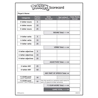 POSSUM is a dice game in which players use six dice to spell out words and earn points by filling categories on their scorecards. The categories are arranged by parts of speech. Players have to make nouns, verbs, and adjectives. They also try to make 5- and 6-letter words of any part of speech. Players get extra points for using less common letters in their words. In addition, players can have fun by making up one word�a POSSUM word�as long as they can use it in a sentence and name its part of speech in that sentence. Points are recorded on a scorecard, and the player with the most points at the end of the game is the winner. Includes an instruction sheet, 6 letter dice, and 100 scorecards. For 2-6 players. For ages 8+.