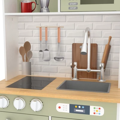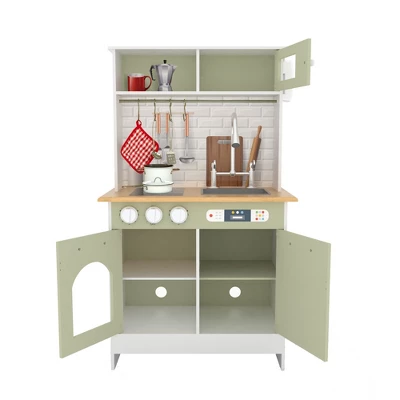 Give your little one their own cooking space with the Teamson Kids Little Chef Boston Kids Kitchen Playset. This modern play kitchen features white and light olive green finishes with a subway tile style backsplash and silver accents, making it great for both boys and girls, and it completes any home, classroom, preschool, or daycare playroom. The functional and interactive design features three openable doors, three rotating and clicking oven knobs, two printed induction burners, a sink with faucet, a storage shelf, and four hanging hooks to enhance your little one’s play time. With 9 included accessories – a plastic pot with lid, a pan, a spatula, a ladle, salt and pepper shaker bottles, and a phone – this toddler kitchen encourages role play and lights up your little chef’s imagination and creativity. The durable MDF construction is kid-safe and easy to wipe clean for every day messes. The easy-to-follow instructions allow for quick adult assembly so play time can start right away. This kid-sized kitchen measures 22.25″ x 12″ x 37.5″ and is recommended for children ages 3 years and up.Teamson is a global lifestyle home designs brand bringing joy into every home through beautiful, quality pieces made for stylishly comfortable everyday living. Our Teamson Kids brands give flight to fun, discovery and learning through beautifully crafted, safe, and trend-right furniture pieces and toys for kids with a spirit of curiosity and adventure.