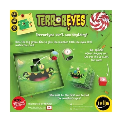 TerrorEyes can’t see anything! His eyes have fallen out again… To win, help him put them back correctly before someone else does so instead!In TerrorEyes, roll Eye dice as fast as possible to find the right eyes and put them back in place in the monster’s face. While you do this, other players take turns rolling the red Hand die until they roll the Hand, which lets them take the Eye dice, complete the face, and score points!2-6 playersAges 5+10 minute play time