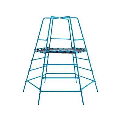 Gather all the neighborhood kids outside and watch as their imagination grows and their laughter increases with this creative backyard playset, a fantastic alternative to exercise. The frame on the Explorer 2 Playset is constructed with premium galvanized steel and fashioned with a mesh vinyl play form as well as a polyester canopy for optimum safety. The Explorer 2 has round viewing windows to look out from when they finally reached the top as well as roll-up doors to keep out intruders or let in allies to their fun new fort. Designed for ages 3-12 and a maximum weight of 220lbs., this set is perfect for any backyard or playground. It also includes a fun printed explorer themed playmat. At full height, it’s 82.5” tall with the platform at 47” height & a base diameter of 82”. Low height is 53.5” tall with the platform at 22” height & a base diameter of 66.5”.