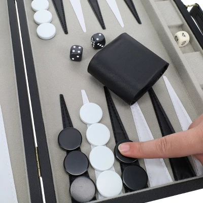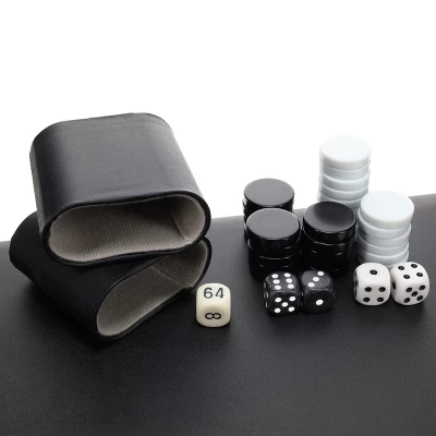 - BACKGAMMON BOARD GAME INCLUDES: Game instructions booklet, 2 black leatherette dice cups with felt interior, 30 backgammon pieces and 4 dice in black and white, and 1 doubling cube. 2 Player Games