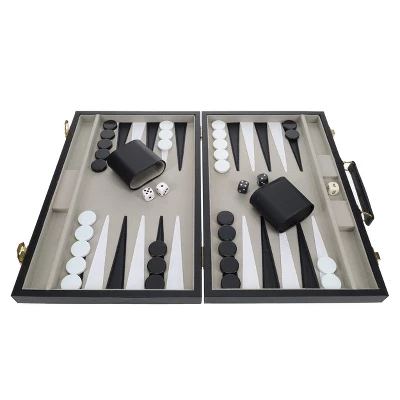 A classic 15 inch backgammon set in a stylish black leatherette briefcase with brass latches that contains everything you need for a challenging game of backgammon. The sturdy and intricate construction of this set is what sets it apart from others. The playing field is a soft velvety fabric with leatherette points sewn onto the surface. The set includes 30 backgammon chips in two different colors, 2 felt lined dice cups, 4 dice in two different colors, and 1 doubling cube. The dice cups are made with the same material as the game itself and are felt-lined to keep the dice rolling noise to a minimum. All the games pieces fit nicely within the game case for easy storage when traveling. This is a handsome addition to your game collection. It is up to you to bring the strategy! Chips: 1.06 in. x .235. Dice: .576 in. , Doubling Cube: .610 in., Dice Cups: 2.665 in. x 1.49 in.