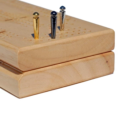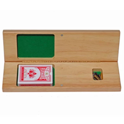 This beautiful three-track cabinet cribbage board is crafted from eco-friendly and sustainable solid Malaysian Oak hardwood with a satin finish applied. The natural, solid-wood board has a piano styled hinge for strength and a magnetic closure to keep the 9 metal easy-grip pegs and deck of cards stored neatly inside. Velveteen felt lines the storage compartments within the board. The continuous three track scoring surface has a 90 point skunk line and numerical notations printed in black. The peg holes are precision drilled. Includes 3 peg starting area, 120 count full-sized board, skunk lines, a peg out finish hole and game wins tracking. It is the perfect gift for Father’s Day, graduation, housewarming, or for the newly weds that love the game of cribbage. This gift will be cherished for generations.
