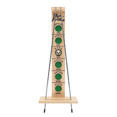 This nostalgic wooden game first became popular in the USA in the 1940’s and has been engaging game lovers ever since. Manipulate the metal rods to project the metal ball up the slope towards you to drop it into Pluto. Open the rods too much, and the ball will drop too soon into Mercury, Earth, Mars, Jupiter or Saturn earning the player less points. It’s an incredibly addictive game that will have the whole family shooting the metal ball down the rails and shooting for the moon! Seems simple enough right? See for yourself why people go crazy for this game. Looks great on coffee tables or an office desk, adding a stylish flare to any space. The board is made of solid Malaysian Oak wood in its natural color with a glossy finish. Game board is screen printed. The planet wells are lined with felt for softer landings. Some assembly is required.