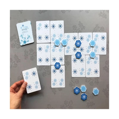 In Winter, two players compete to be the player with the most chips of their color on the lake at the end of the game. The game is divided into two phases. In the first, the freezing phase, players will create the frozen lake in a contiguous form using their snowflake cards. They’ll also attempt to secure zones in which they’ve managed to group four snowflakes of their color using chips. In the second phase, the unfreezing, they’ll undo the creation by moving and retrieving their cards and chips of their color. At the end of the game, the player with the most chips on the table is declared the winner.Winter is an abstract game for 2 players ages 8 and up. Games last 10 minutes in which good decisions are everything. This is a reissue of the 2016 edition with all new mechanics.Winter was the winner of the 2021 Cardboard Edison Award. It’s the first of a series of the 4 Seasons series that will continue later with Autumn, Summer, and Spring.