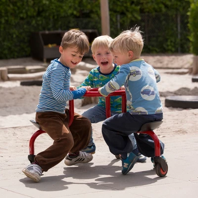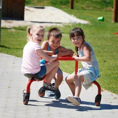 This funny carousel challenges children’s ability to coordinate. The vehicle provides numerous plays of social character, as the children can chat and interact in many ways, while being seated face to face. Harmonious, safe design with no sharp edges. Strong, oval-shaped tubes ensure maximum strength. Spokeless wheels with solid rubber tires. Effective rust protection and impact-resistant powder coating that will last for many years. Develops and improves coordination and motor skills. Weather-resistant rubber seat. Seat height: 12″. Assembled: 39.76″ L x 16.93″ W x 20.47″ H.