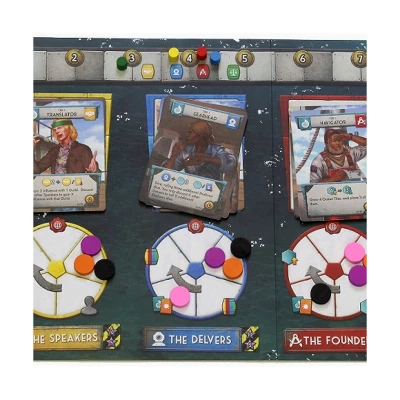 Flotilla features two distinct and interwoven modes of gameplay, as you try to outpace your opponents in bringing prosperity to humanity’s new home. You begin the game as a “Sinkside” Fleet Commander, commissioned by world leaders to explore the new face of the ocean, scour the depths for resources, and rescue any survivors you come across. At any point in the game, you may choose to turn “Skyside,” by selling your skiffs, and leaving your seafaring life behind to now grow the Flotilla itself.The choice of if or when to switch from a “Sinkside” explorer to a “Skyside” settler defines the very core experience of Flotilla. They represent two similar but distinct game experiences, utilizing the same game components, seamlessly intertwined among all players. If you switch, you’ll flip over all of your accumulated game components, watching your crew grow into new roles with new art for the same characters, while finding entirely new uses for your ocean tiles and resources, and beginning to trade with the “Sinkside” players as you go after new objectives. As players turn “Skyside,” different niches are filled, forever changing the game’s economy. Mastering this ebb and flow will be critical if you’re to shape the new face of humanity!As a “Sinksider,” you will explore the ocean with your skiffs, pulling some of the 92 hexagon-shaped ocean tiles out of a bag, and arranging them to help you effectively collect resources, discover valuable artifacts from the sunken civilization, all while trying to avoid toxic radiation left from the disaster. You’ll dive for supplies, rolling a pool of custom dive dice that vary based on the depth level of your skiffs. You’ll also carefully manage your resources, trading them on the open market for the currency you can use to buy more skiffs and outposts, or stockpiling them for when you turn “Skyside.”As a “Skysider,” you will use your resources to build an expansive network of watercraft and docks, using the “Skyside” of your ocean tiles. Your divers will also have new jobs as researchers, rolling custom, multicolor Research dice, to discover new technologies that allow the Flotilla to manage a growing population. You’ll also build Sonar stations, making life a little easier for the “Sinksiders” still out exploring the unknown, while earning quite a few points for yourself.On both sides, you’ll also grow your relationships with the four different governing guilds, each giving you unique bonuses and more powerful crew. The players with the strongest relationships will also earn valuable points at the end of the game!The components in Flotilla are unique, immersive, and interconnected. Your skiffs will be able to actually carry up to four resource barrels and come in a unique shape for each player color. Artifact tokens slot into matching spaces in a double-layered hub board and art on the ocean tiles lines up to create a unique layout for your growing Flotilla each time you play.In Flotilla, you’ll find significant strategic depth and variety, while giving players the freedom to tell their own story. Will you build the Flotilla by being the first to go Skyside, or stay Sinkside for the whole game, becoming the most powerful seafarer of them all?