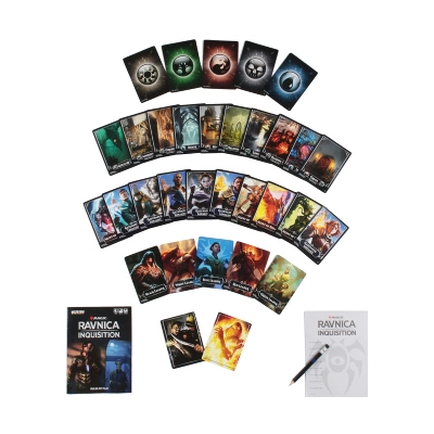 Join the Gatewatch or pledge your loyalty to Nicol Bolas in Ravnica: Inquisition, a social deduction game set on the Magic: The Gathering plane of Ravnica. Each player takes on the role of a representative of a Ravnican Guild that is either loyal to the Gatewatch or an Agent of Bolas. The Gatewatch loyalists are tasked with discovering who the Agents of Bolas are, while the Agents of Bolas simply need to survive in order to further the schemes of Nicol Bolas.Players will elect leaders for each of the 5 colors, but only players whose guild’s color pair contains the color may be voted for. Each color leader has a special power they can use to further their goals, so players must be careful when voting, lest Nicol Bolas’ influence grow. Once all the color leaders have been elected, a vote is held to eliminate 1 player. Once the dust has settled, players will reveal their roles, and if the Agents of Bolas were eliminated, the Gatewatch wins!A social deduction game for 5-10 players, Ravnica: Inquisition is great for both fans of party games and fans of Magic: The Gathering!
