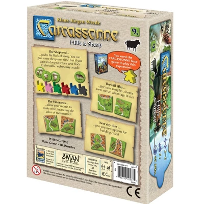 The land outside the city of Carcassonne is lush and green with rolling hills and small cities. In Carcassonne Expansion #9: Hills & Sheep, players can take advantage of the land to manage a flock of sheep, cultivate vineyards, and build hills. The shepherd carefully watches over his flock as they wander through the fields. Over time the flock can grow but be careful; if you wait too long to return your flock to the stable, wolves may attack. Add a thriving vineyard to grow wine around a monastery and increase its value. Get a better view with the hills and gain the advantage from the high ground.